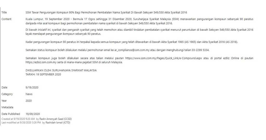 Bermula 17 Ogos sehingga 31 Disember 2020, Suruhanjaya Syarikat Malaysia (SSM) menawarkan pengurangan kompaun sebanyak 90 peratus daripada nilai asal kompaun bagi permohonan pembatalan nama syarikat di bawah Seksyen 549/550 Akta Syarikat 2016.